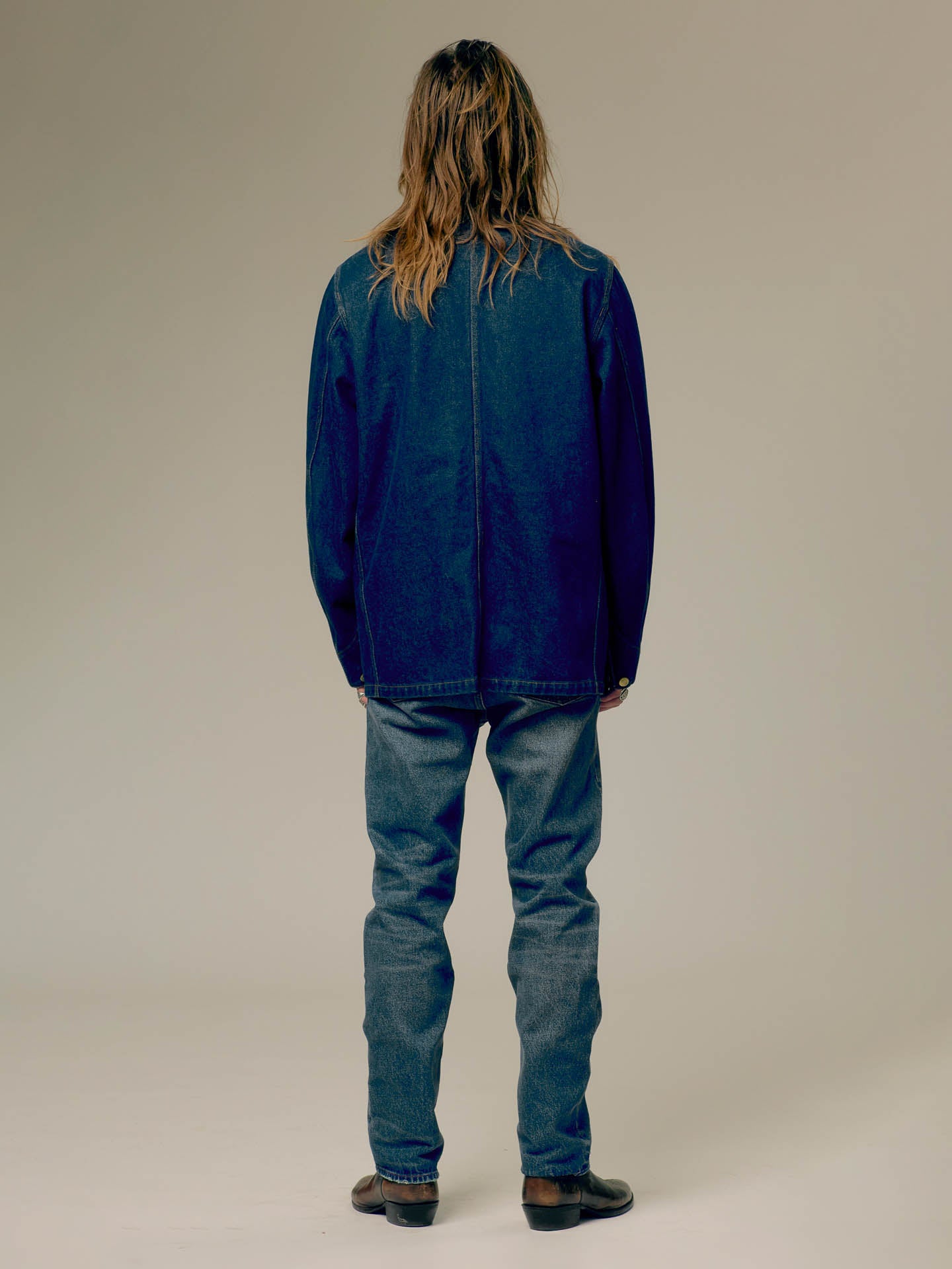 In our reinterpretation we have focused on accentuating the quintessential design elements unique to this jacket type, with the scope to give it some more edge to make it stand out amid other market alternatives. This includes an extra pointy collar silhouette with narrow notch spread done in signature corduroy, enlarged hip pockets and custom-made buttons and rivets. To keep it simple and clean we opted for an unlined shell construction with triple stitched main seams and French seams finishing on the inside. French seams are a sewing technique used to enclose the raw edges of fabric inside a neatly finished seam, providing a clean and polished look on the inside of a garment. This technique not only improves the garment's aesthetics but also its overall quality and longevity.